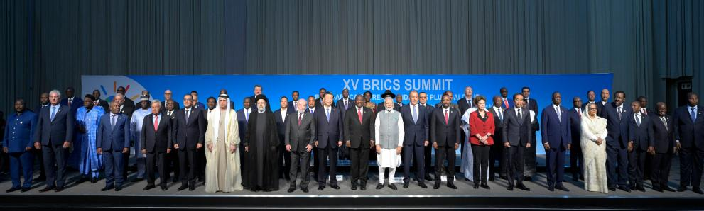 Chinese President Xi Jinping poses for a group photo with other leaders attending the BRICS-Africa Outreach and BRICS Plus Dialogue in Johannesburg, South Africa, Aug. 24, 2023. The event was hosted by South African President Cyril Ramaphosa, and also attended by Brazilian President Luiz Inacio Lula da Silva and Indian Prime Minister Narendra Modi. Russian President Vladimir Putin participated online. More than 60 leaders and representatives of African countries and other emerging markets and developing countries, as well as UN Secretary-General Antonio Guterres, President of the New Development Bank Dilma Rousseff, and leaders of other international and regional organizations, also attended the event. (Xinhua/Li Xueren)