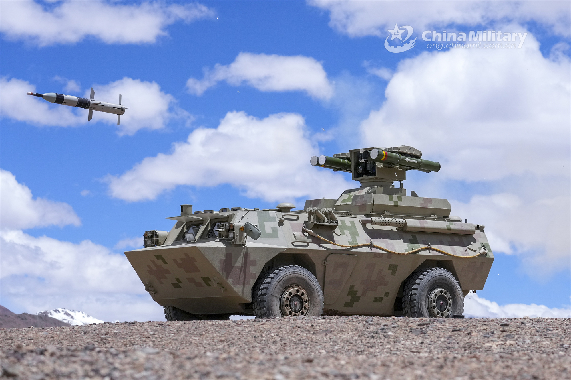 A wheeled heavy armored vehicle attached an army unit fires an HJ-9 anti tank missile at mock target during a live-fire training exercise. The training exercise held recently aimed to test the weapons' tactical qualities in harsh environment. (eng.chinamil.com.cn/Photo by Feng Chiyu)