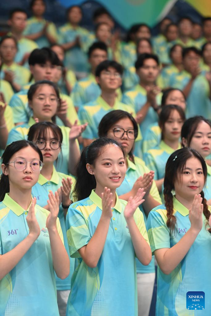 Volunteers clap hands during the Hangzhou Asian Games and Hangzhou Asian Para Games Volunteers Commencement Ceremony in Hangzhou, capital of east China's Zhejiang Province, Aug. 24, 2023. (Xinhua/Huang Zongzhi)