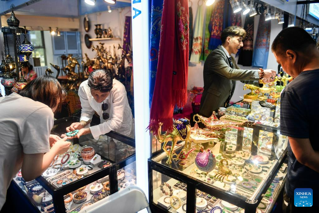 Visitors buy products from Nepal at the 14th China-Northeast Asia Expo in Changchun, the capital city of northeast China's Jilin Province, Aug. 24, 2023. The 14th China-Northeast Asia Expo opened Wednesday in Changchun. The five-day event, scheduled both online and offline, has attracted more than 1,000 companies from home and abroad, with a predominant representation from countries in Northeast Asia. (Xinhua/Xu Chang)