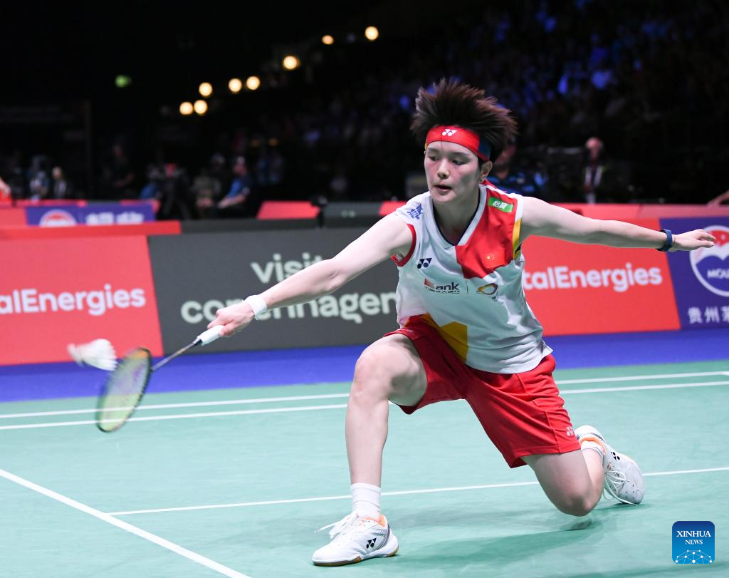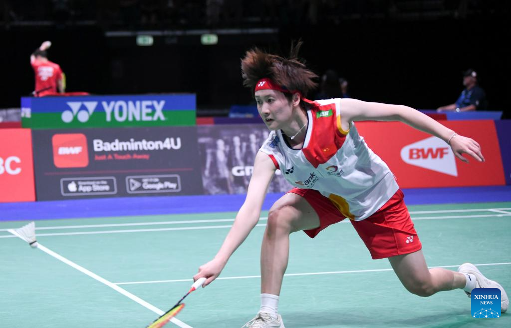 Wang Zhiyi of China hits a return during the women's singles round of 16 match against He Bingjiao of China at the BWF World Championships 2023 in Copenhagen, Denmark, Aug. 24, 2023. (Xinhua/Ren Pengfei)