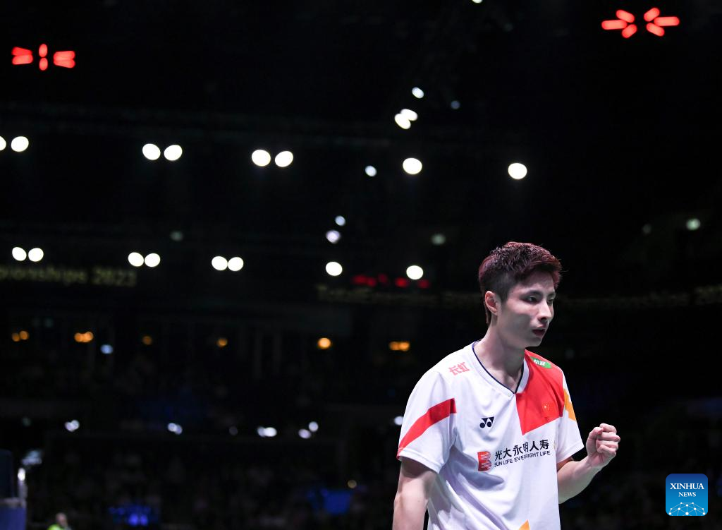 Shi Yuqi of China celebrates during the men's singles round of 16 match against Ng Ka Long Angus of China's Hong Kong at the BWF World Championships 2023 in Copenhagen, Denmark, Aug. 24, 2023. (Xinhua/Ren Pengfei)