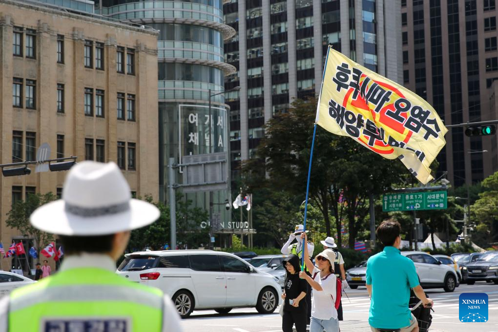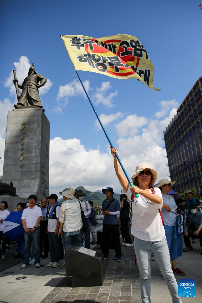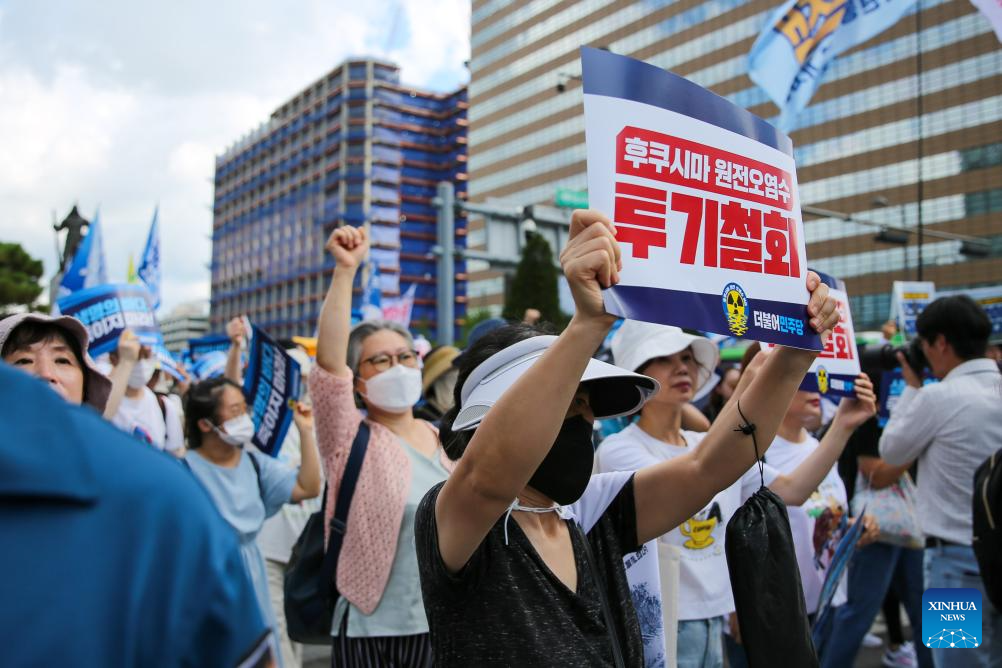 People protest against Japan's decision to release nuclear-contaminated wastewater in Seoul, South Korea, Aug. 25, 2023. Japan started releasing nuclear-contaminated wastewater from the crippled Fukushima Daiichi Nuclear Power Plant into the Pacific Ocean on Thursday, disregarding public concerns and strong opposition from both home and abroad. (Xinhua/Wang Yiliang)