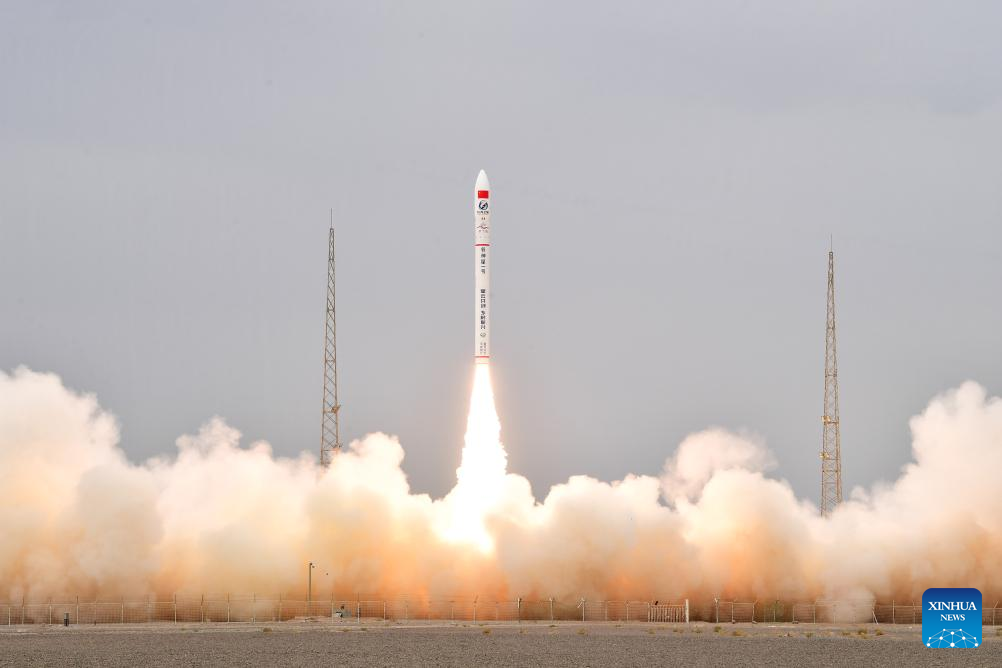 The CERES-1 Y8 carrier rocket carrying the Jilin-1 Kuanfu 02A satellite blasts off from the Jiuquan Satellite Launch Center in northwest China, Aug. 25, 2023. The commercial rocket blasted off at 12:59 p.m. (Beijing Time) from the launch site. The launch was the 8th flight mission to use the CERES-1 rocket series. (Photo by Wang Jiangbo/Xinhua)