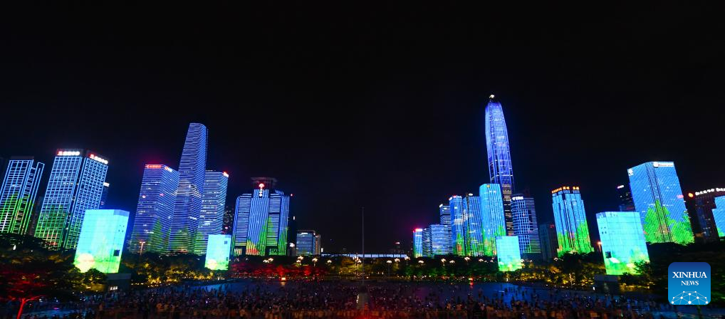 This photo taken on Aug. 25, 2023 shows a light show in Shenzhen, south China's Guangdong Province. A light show was held in Shenzhen on Friday to celebrate the 43rd anniversary of the establishment of the Shenzhen Special Economic Zone. (Xinhua/Liang Xu)