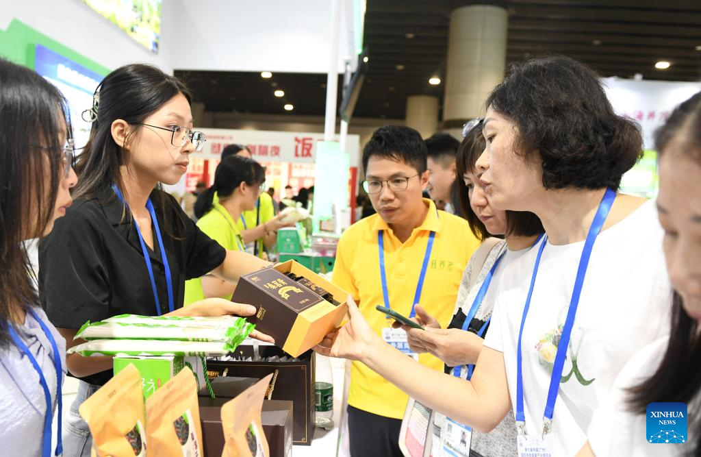 People visit the Guangzhou Fair in Guangzhou, south China's Guangdong Province, Aug. 25, 2023. The 31st Guangzhou Fair opened here on Friday, with an exhibiting area of 90,000 square meters and nine exhibition pavilions. (Xinhua/Lu Hanxin)
