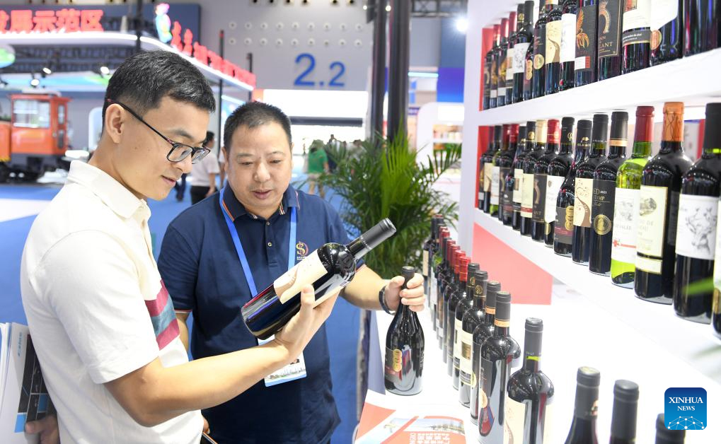 A man selects wine during the Guangzhou Fair in Guangzhou, south China's Guangdong Province, Aug. 25, 2023. The 31st Guangzhou Fair opened here on Friday, with an exhibiting area of 90,000 square meters and nine exhibition pavilions. (Xinhua/Lu Hanxin)