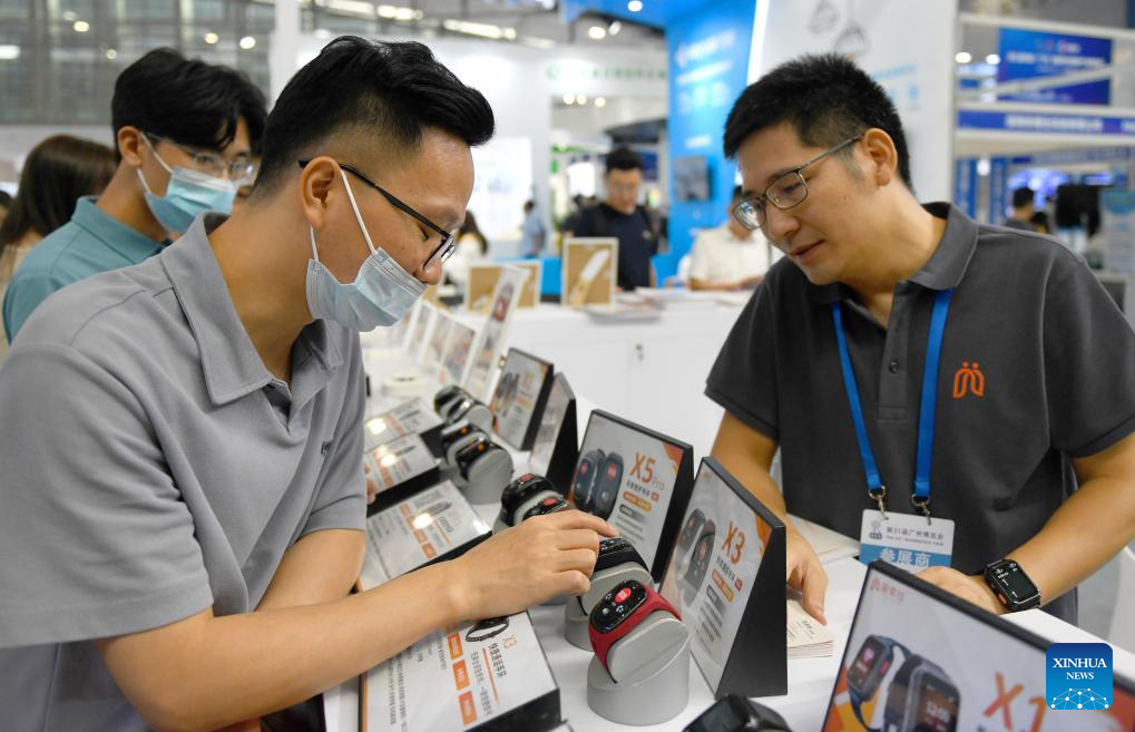 A man selects smart watch during the Guangzhou Fair in Guangzhou, south China's Guangdong Province, Aug. 25, 2023. The 31st Guangzhou Fair opened here on Friday, with an exhibiting area of 90,000 square meters and nine exhibition pavilions. (Xinhua/Lu Hanxin)