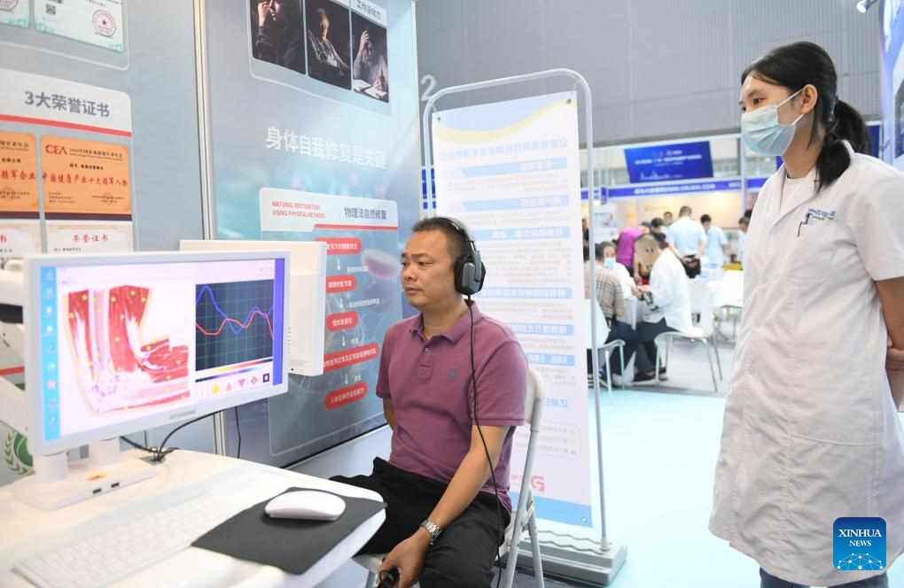 A man experiences physical examination during the Guangzhou Fair in Guangzhou, south China's Guangdong Province, Aug. 25, 2023. The 31st Guangzhou Fair opened here on Friday, with an exhibiting area of 90,000 square meters and nine exhibition pavilions. (Xinhua/Lu Hanxin)