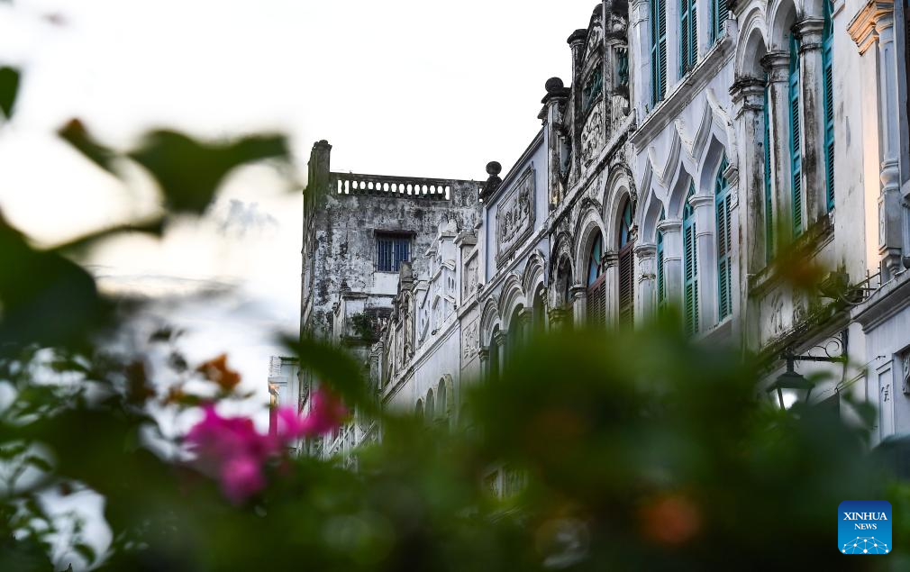 This photo taken on Aug. 21, 2023 shows part of buildings at the Qilou old street in Haikou, south China's Hainan Province. (Xinhua/Yang Guanyu)