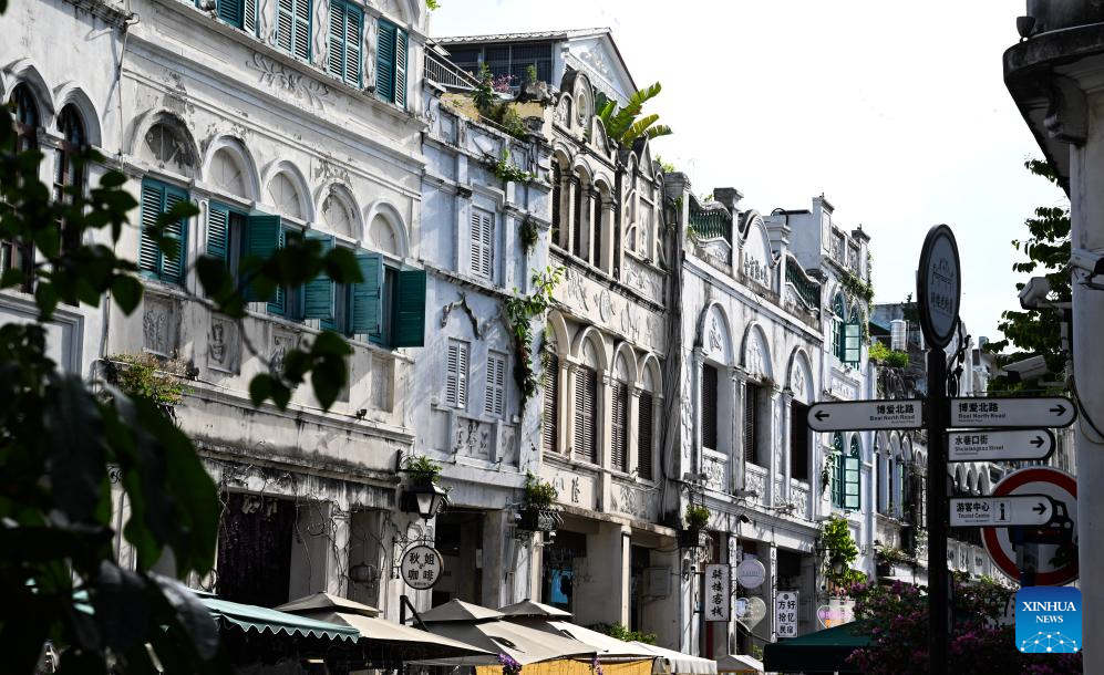 This photo taken on Aug. 20, 2023 shows part of buildings at the Qilou old street in Haikou, south China's Hainan Province. (Xinhua/Yang Guanyu)
