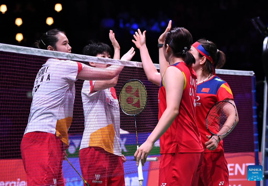 Chen Qingchen (1st R)/Jia Yifan (2nd R) of China greet Zhang Shuxian (3rd R)/Zheng Yu of China after their women's doubles semifinal match at the BWF World Championships 2023 badminton tournament in Copenhagen, Denmark, Aug. 26, 2023. (Xinhua/Ren Pengfei)