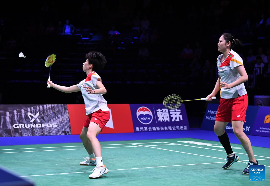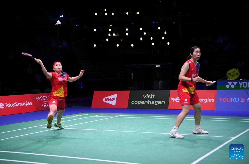 Chen Qingchen (R)/Jia Yifan of China compete during the women's doubles semifinal match against Zhang Shuxian/Zheng Yu of China at the BWF World Championships 2023 badminton tournament in Copenhagen, Denmark, Aug. 26, 2023. (Xinhua/Ren Pengfei)