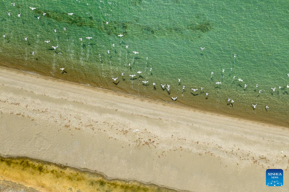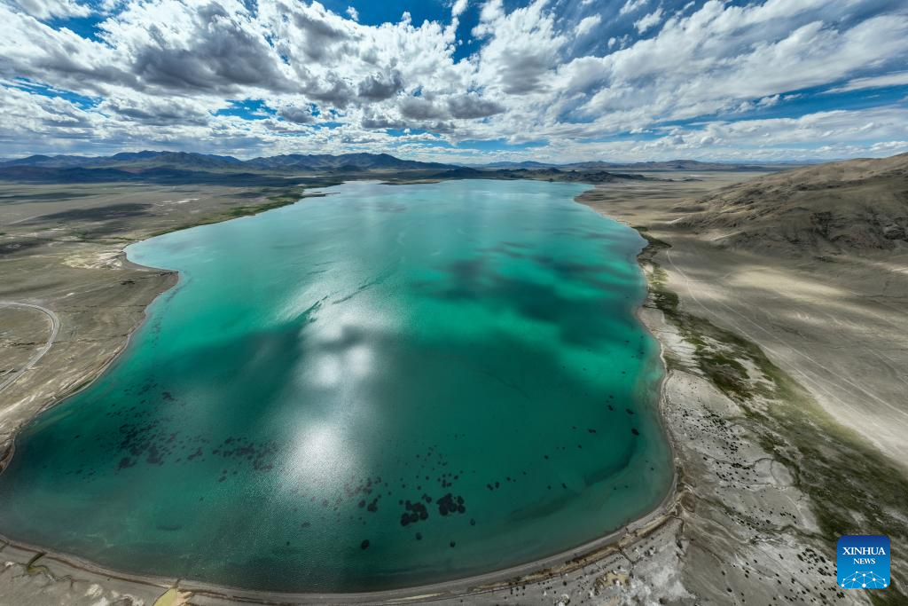 This aerial photo taken on Aug. 25, 2023 shows the scenery of a lake at Ge'gyai County of Ngari Prefecture, in southwest China's Tibet Autonomous Region. (Photo by Tenzin Norbu/Xinhua)