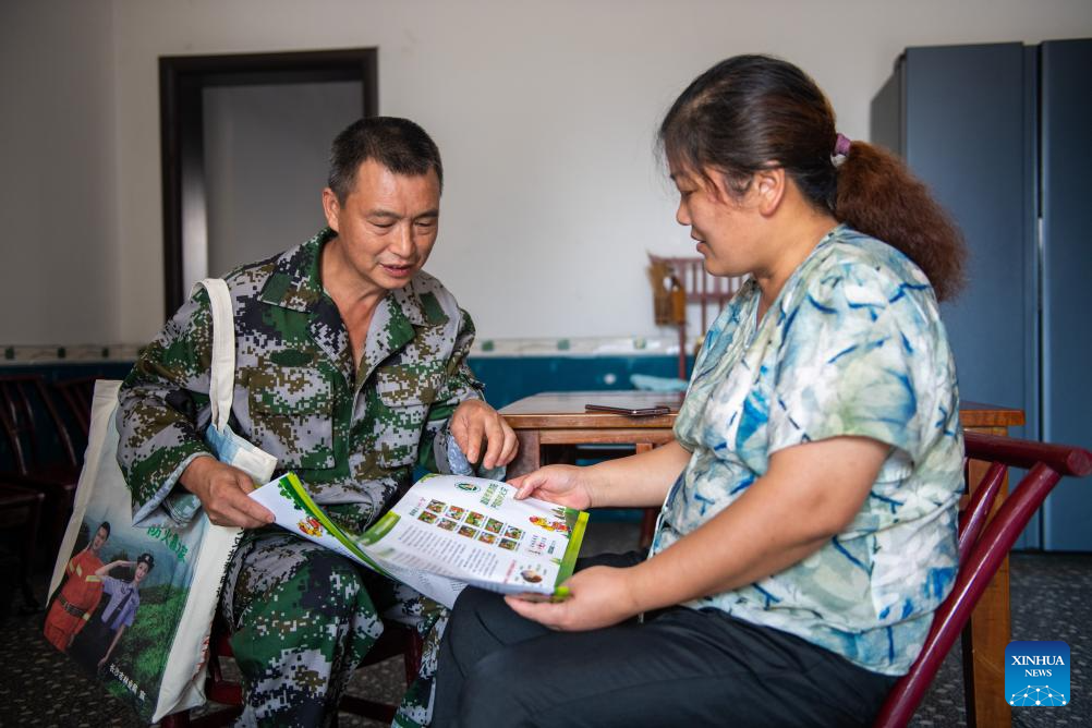 Huang Weigu (L) introduces protection knowledge of ancient trees to a villager in Pingwan Village of Jingang Town, Liuyang City of central China's Hunan Province, Aug. 24, 2023. (Xinhua/Chen Sihan)