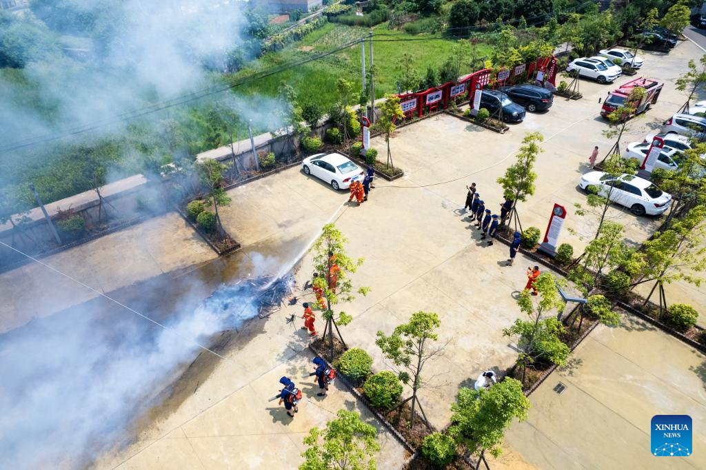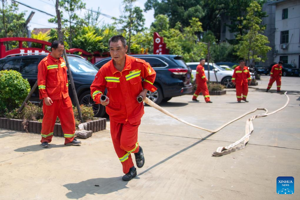 Huang Weigu (2nd L) and his colleagues take part in a fire drill in Jingang Town, Liuyang City of central China's Hunan Province, Aug. 25, 2023. (Xinhua/Chen Sihan)