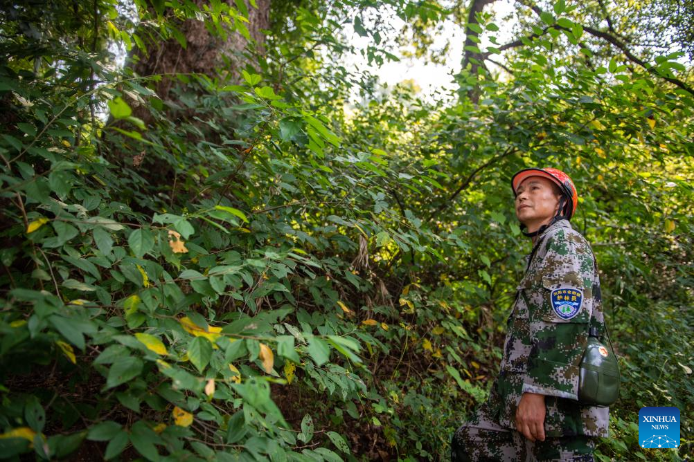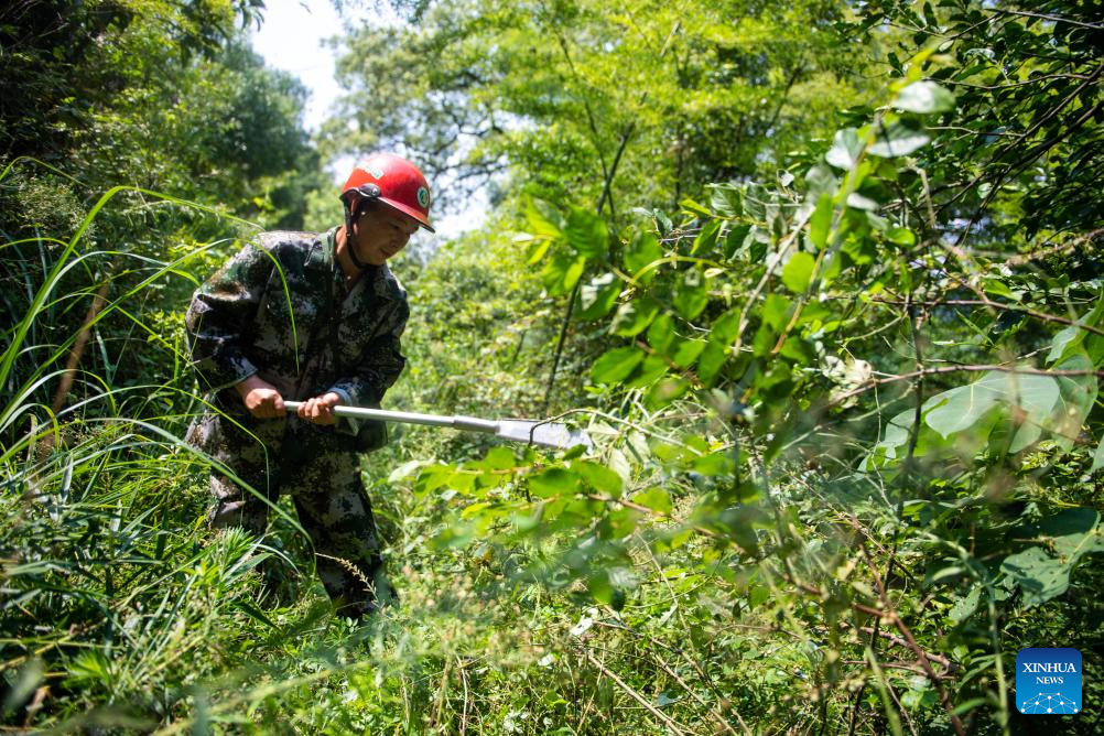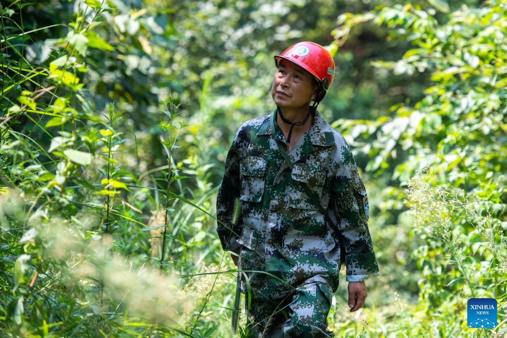 Huang Weigu patrols on a mountain in Pingwan Village of Jingang Town, Liuyang City of central China's Hunan Province, Aug. 24, 2023. (Xinhua/Chen Sihan)
