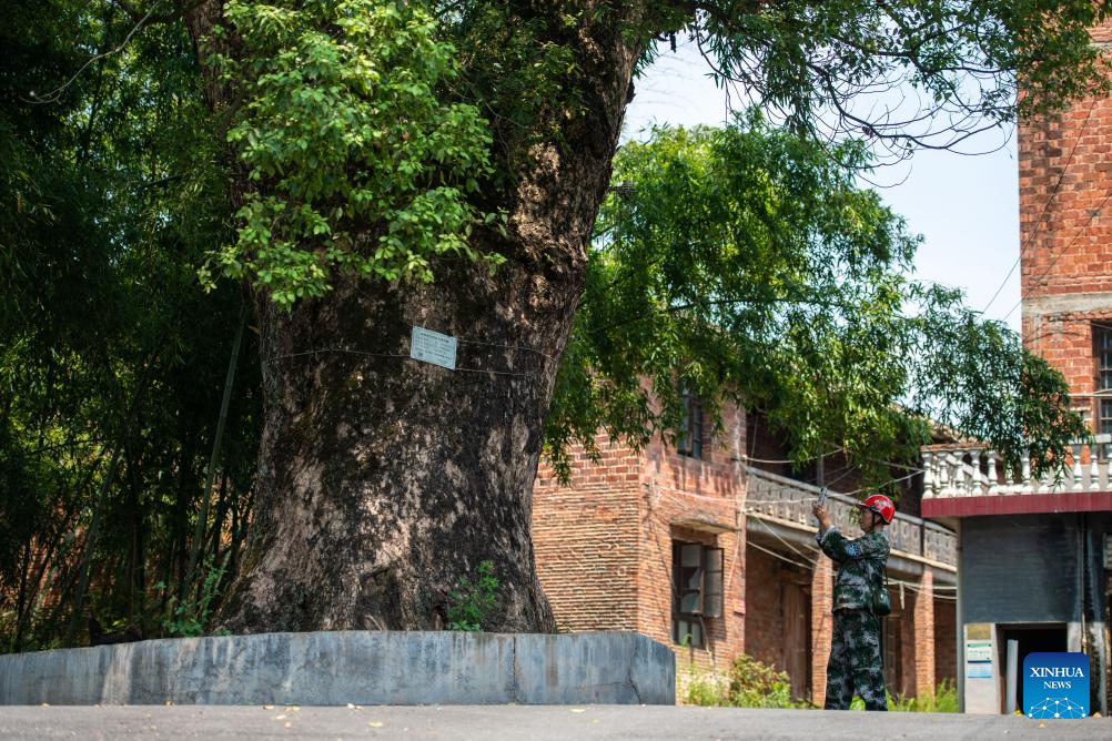 Huang Weigu monitors the growth of an ancient tree in Pingwan Village of Jingang Town, Liuyang City of central China's Hunan Province, Aug. 24, 2023. (Xinhua/Chen Sihan)