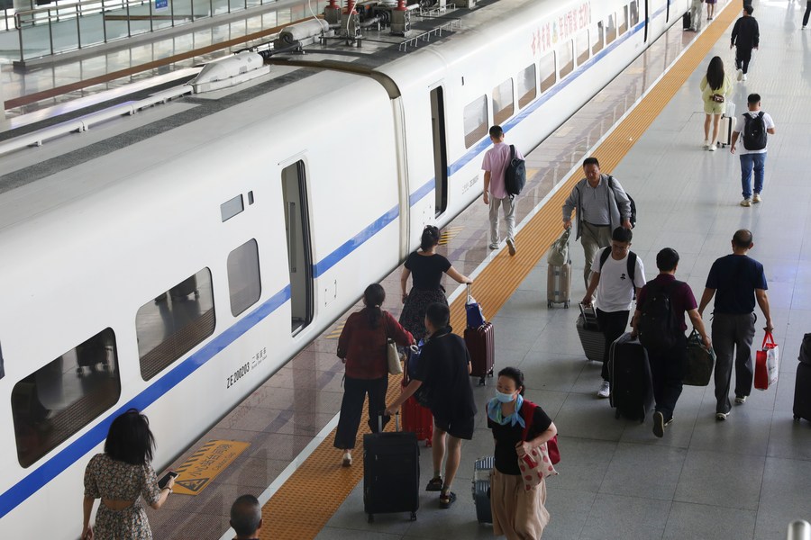 Passengers get on and off a train at Xuzhou East Railway Station in Xuzhou, east China's Jiangsu Province, Aug. 1, 2023. (Xinhua/Mao Jun)