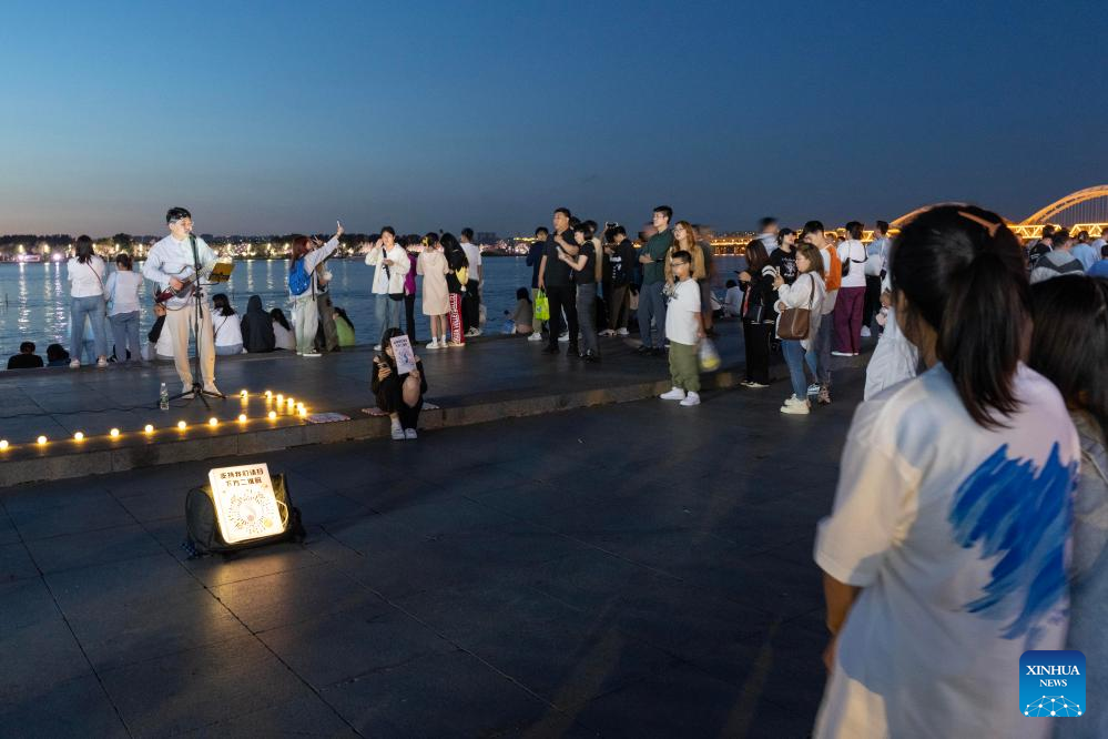 A singer performs at a park along the Songhua River in Harbin, northeast China's Heilongjiang Province, Aug. 27, 2023. (Xinhua/Xie Jianfei)
