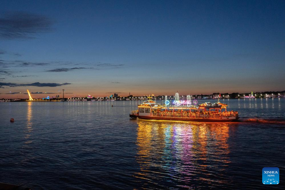 Visitors take a sightseeing boat on the Songhua River in Harbin, northeast China's Heilongjiang Province, Aug. 27, 2023. (Xinhua/Xie Jianfei)