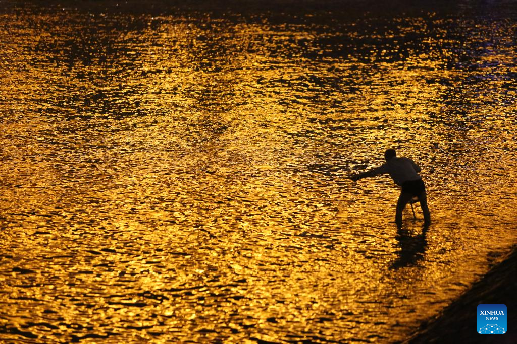 A man collects the offshore garbage along the Songhua River in Harbin, northeast China's Heilongjiang Province, Aug. 27, 2023. (Xinhua/Shi Feng)