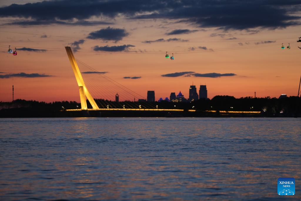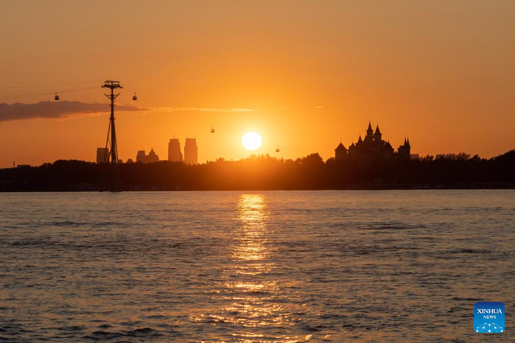This photo taken on Aug. 27, 2023 shows the sunset view along the Songhua River in Harbin, northeast China's Heilongjiang Province, Aug. 27, 2023. (Xinhua/Xie Jianfei)