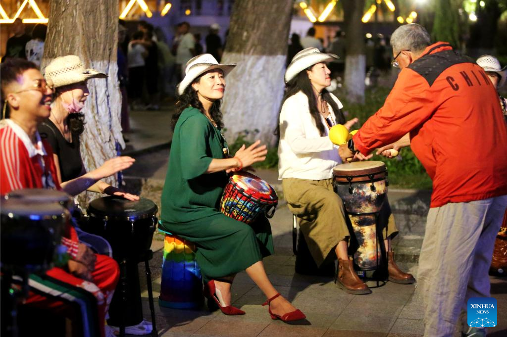 Folk artists perform along the Songhua River in Harbin, northeast China's Heilongjiang Province, Aug. 27, 2023. (Xinhua/Shi Feng)