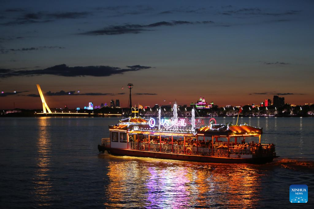 Visitors take a sightseeing boat on the Songhua River in Harbin, northeast China's Heilongjiang Province, Aug. 27, 2023. (Xinhua/Wang Dayu)