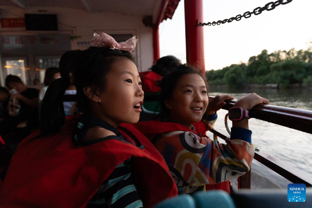 Visitors take a sightseeing boat on the Songhua River in Harbin, northeast China's Heilongjiang Province, Aug. 27, 2023. (Xinhua/Shi Feng)