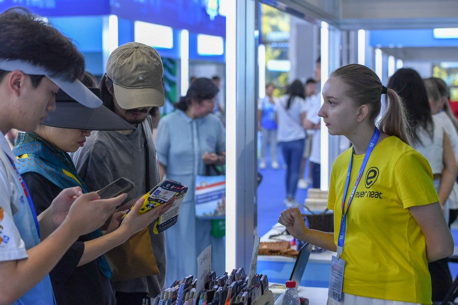A Russian exhibitor introduces products to visitors during the 14th China-Northeast Asia Expo in Changchun, northeast China's Jilin Province, Aug. 23, 2023. (Xinhua/Zhang Nan)