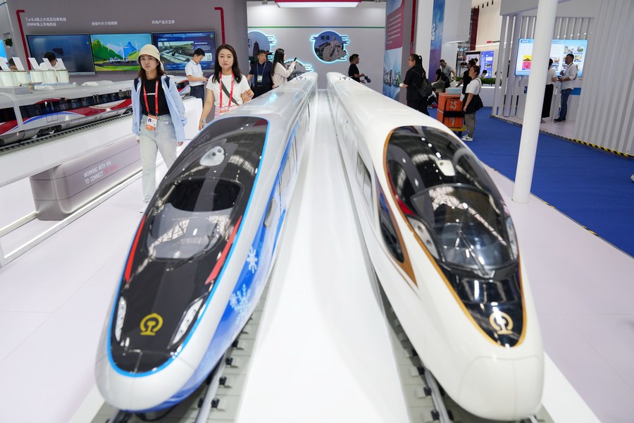 People visit the booth of China Railway Rolling Stock Corporation (CRRC) at the 6th China International Advanced Materials Industry Exposition in Harbin, northeast China's Heilongjiang Province, Aug. 29, 2023. (Xinhua/Wang Jianwei)