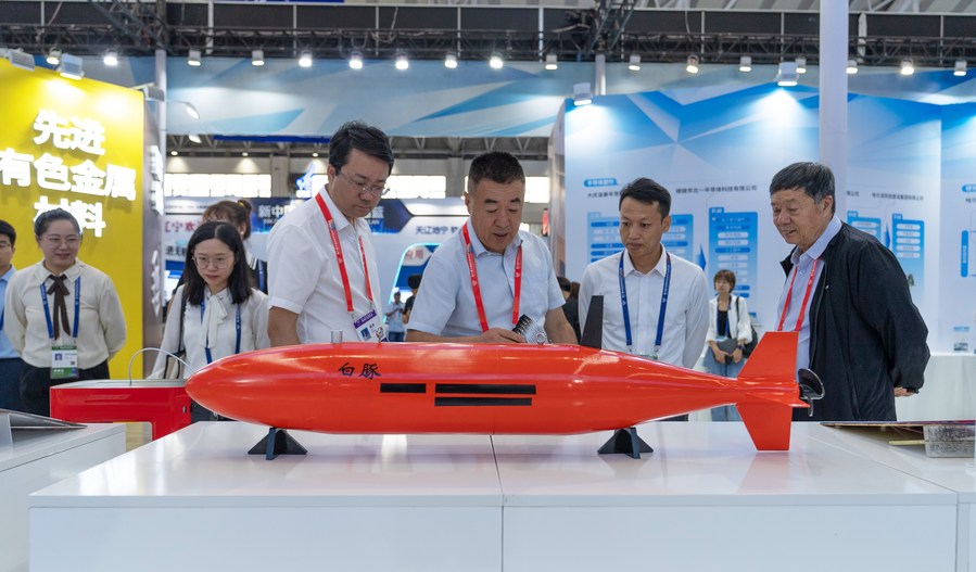 Visitors view a product on display at the 6th China International Advanced Materials Industry Exposition in Harbin, northeast China's Heilongjiang Province, Aug. 29, 2023. (Xinhua/Wang Dayu)