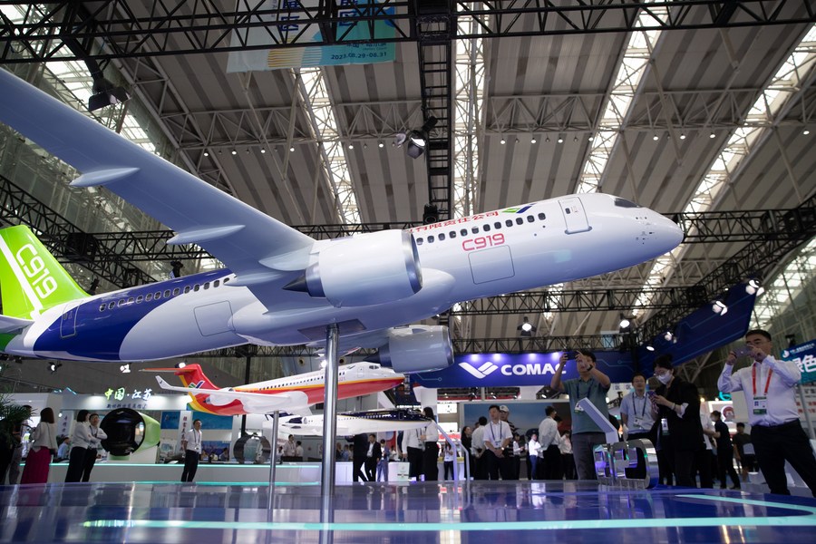 People view a model of C919 aircraft at the 6th China International Advanced Materials Industry Exposition in Harbin, northeast China's Heilongjiang Province, Aug. 29, 2023. (Xinhua/Zhang Tao)