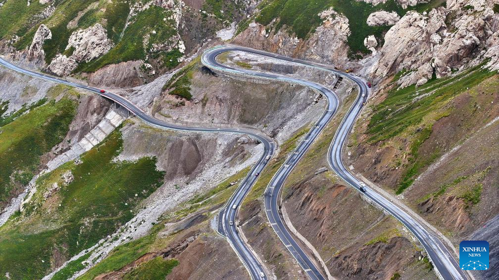 This aerial photo taken on Aug. 22, 2023 shows the view along Duku Highway in northwest China's Xinjiang Uygur Autonomous Region. The Duku Highway, deemed one of China's most beautiful roads, is a scenic mountainous section spanning over 500 kilometers between Dushanzi and Kuqa on China's National Highway 217 in Xinjiang. A major road linking northern and southern Xinjiang, Duku Highway is also famous for its spectacular natural landscape including glaciers, forests, and grasslands. (Xinhua/Wang Peng)
