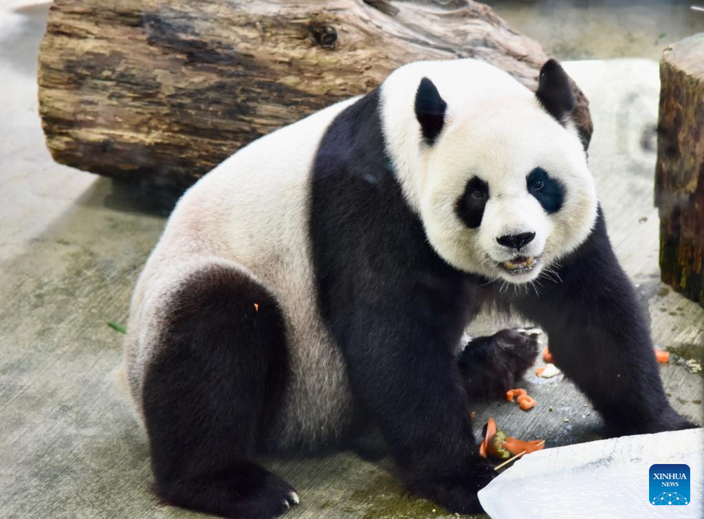 Giant panda Yuan Yuan enjoys a birthday meal at Taipei Zoo in Taipei, southeast China's Taiwan, Aug. 30, 2023. (Xinhua/Wang Chenghao)