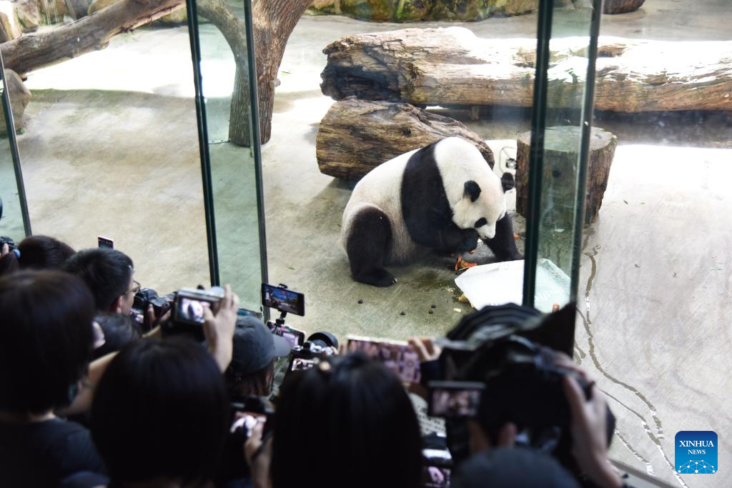 People watch as giant panda Yuan Yuan enjoys a birthday meal at Taipei Zoo in Taipei, southeast China's Taiwan, Aug. 30, 2023. (Xinhua/Wang Chenghao)
