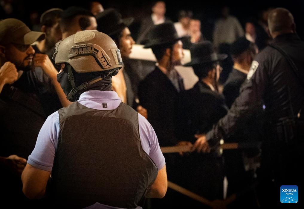 Israeli security forces stand guard at the site of a knife attack at a light rail stop near East Jerusalem, on Aug. 30, 2023. A Palestinian dressed as an ultra-Orthodox Jew stabbed an Israeli in Jerusalem on Wednesday before being shot and killed by the Israeli police. (Photo by Muammar Awad/Xinhua)