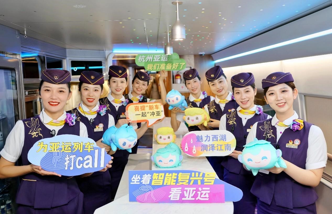 Crew members of a Fuxing bullet train specially designed for the Hangzhou Asian Games pose for a picture on the train in Hangzhou, east China's Zhejiang province, Aug. 4, 2023. (People's Daily Online/Zhou Wei)