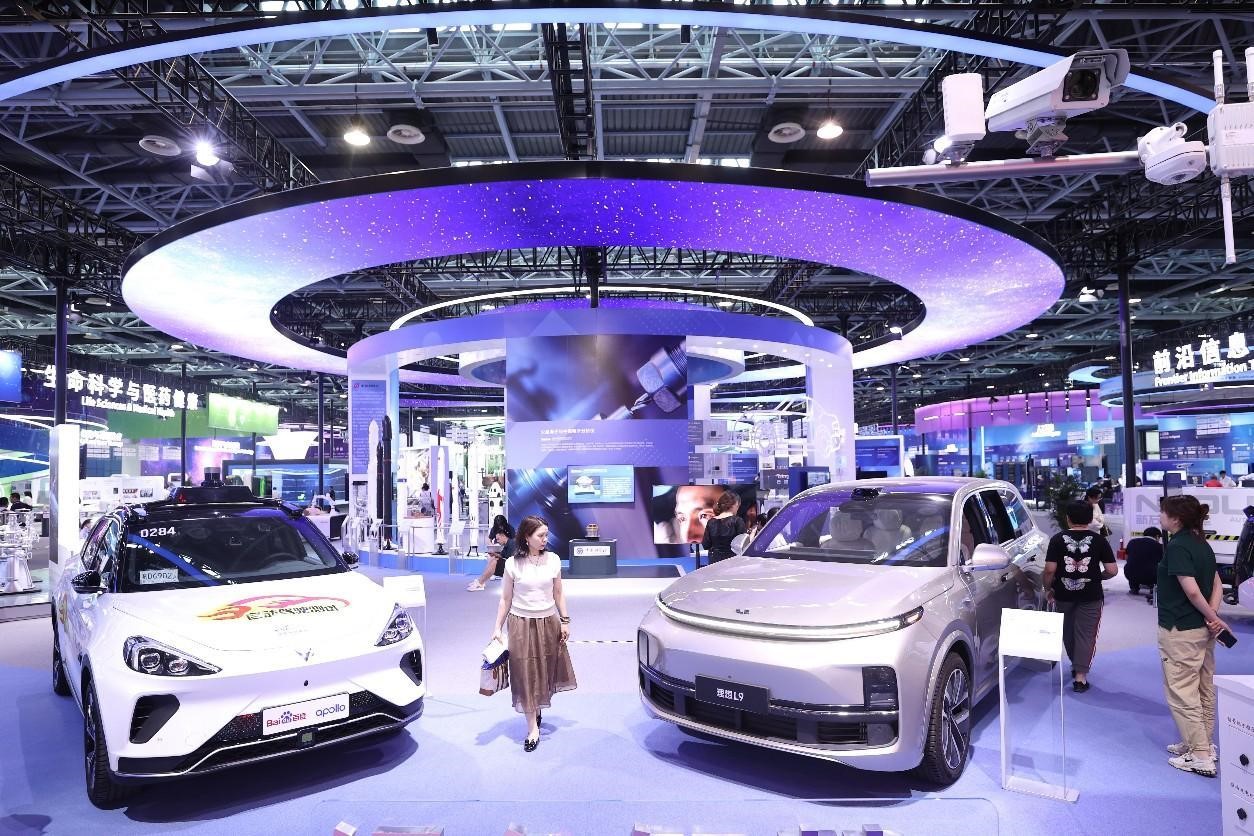 Autopilot vehicles and smart electric vehicles are exhibited at the exhibition area of Zhongguancun Forum in Beijing, capital of China, May 28, 2023. (People's Daily Online/Chen Xiaogen)