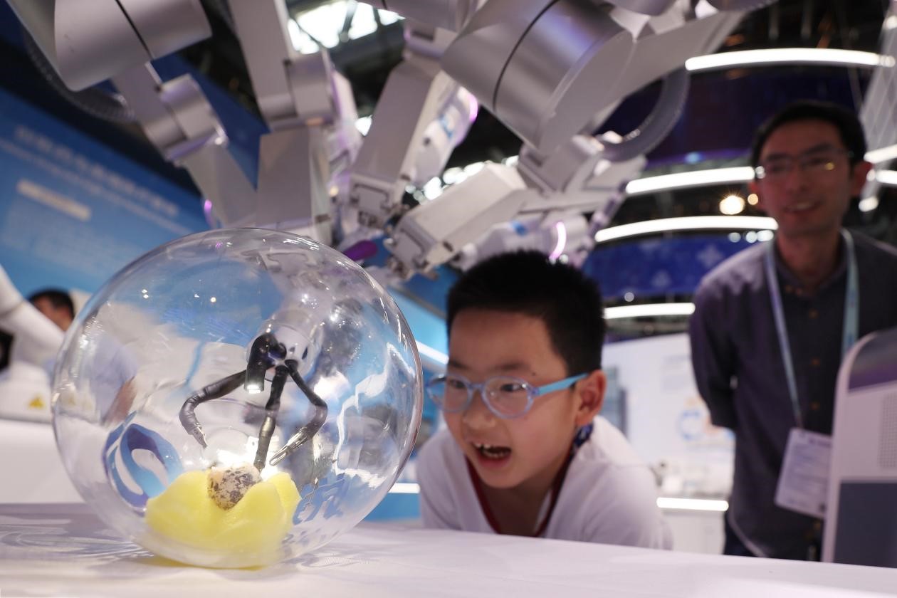 A child watches a surgical robot peel a quail egg at the exhibition area of Zhongguancun Forum in Beijing, capital of China, May 28, 2023. (People's Daily Online/Chen Xiaogen)