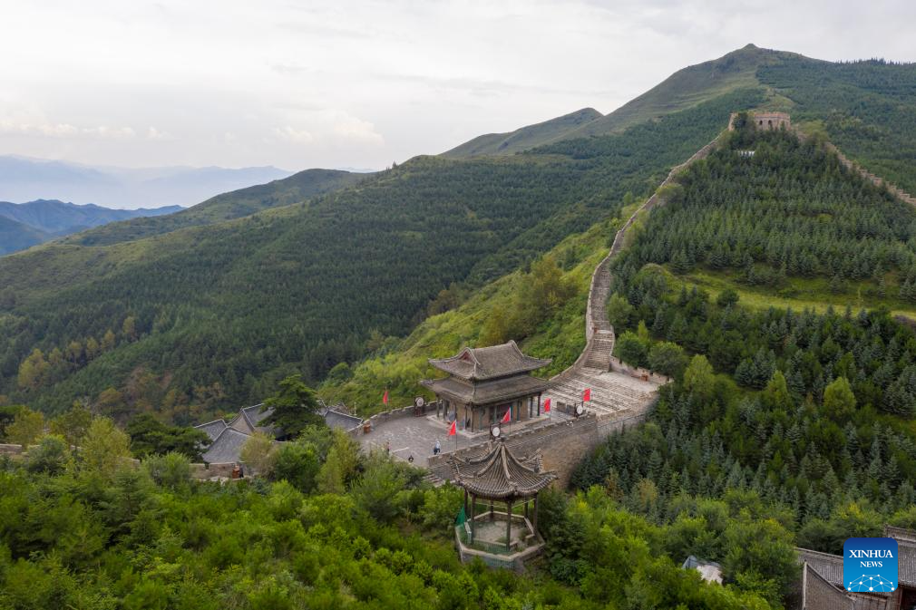 This aerial photo taken on Aug. 30, 2023 shows the Yanmen Pass in Daixian County, north China's Shanxi Province. The Yanmen Pass is a famed part of the Great Wall. The Great Wall, a UNESCO World Heritage Site, consists of many interconnected walls, some dating back 2,000 years. (Xinhua/Liu Jinhai)