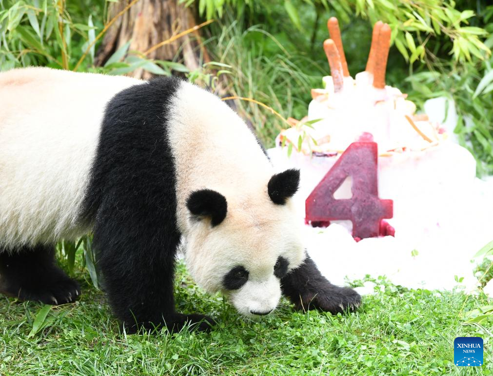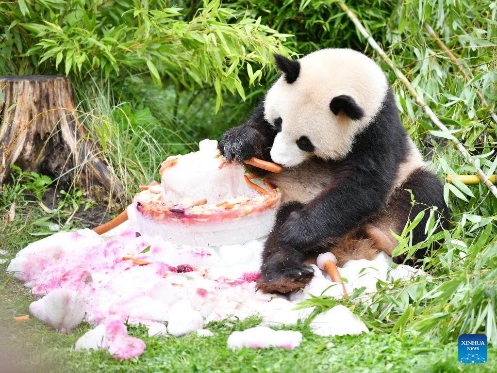 Giant panda Meng Xiang enjoys a "birthday cake" at Zoo Berlin in Berlin, capital of Germany, Aug. 31, 2023. The pair of giant pandas celebrated their fourth birthday in Zoo Berlin on Thursday. (Xinhua/Ren Pengfei)