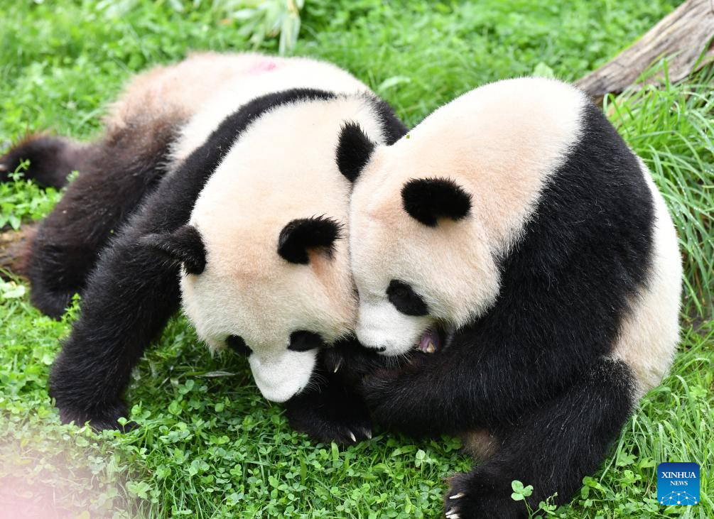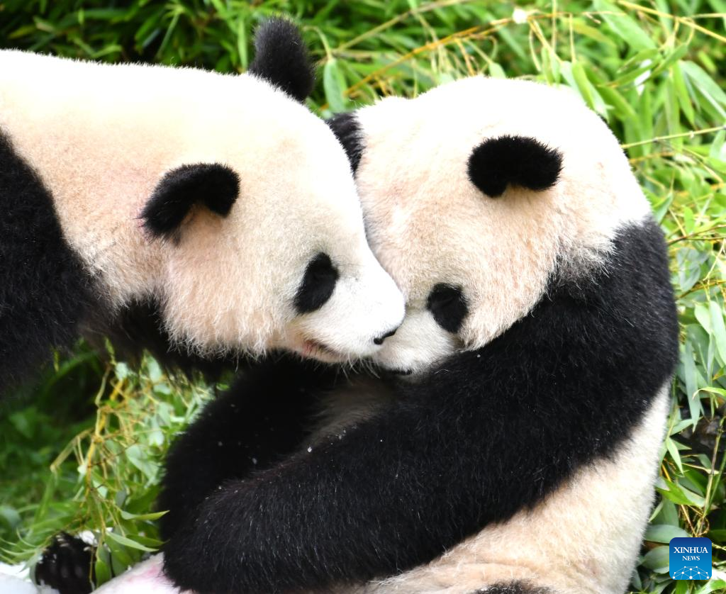 Giant panda Meng Xiang (L) plays with Meng Yuan at Zoo Berlin in Berlin, capital of Germany, Aug. 31, 2023. The pair of giant pandas celebrated their fourth birthday in Zoo Berlin on Thursday. (Xinhua/Ren Pengfei)