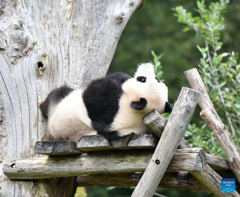 Giant panda Meng Yuan is seen at Zoo Berlin in Berlin, capital of Germany, Aug. 31, 2023. The pair of giant pandas celebrated their fourth birthday in Zoo Berlin on Thursday. (Xinhua/Ren Pengfei)
