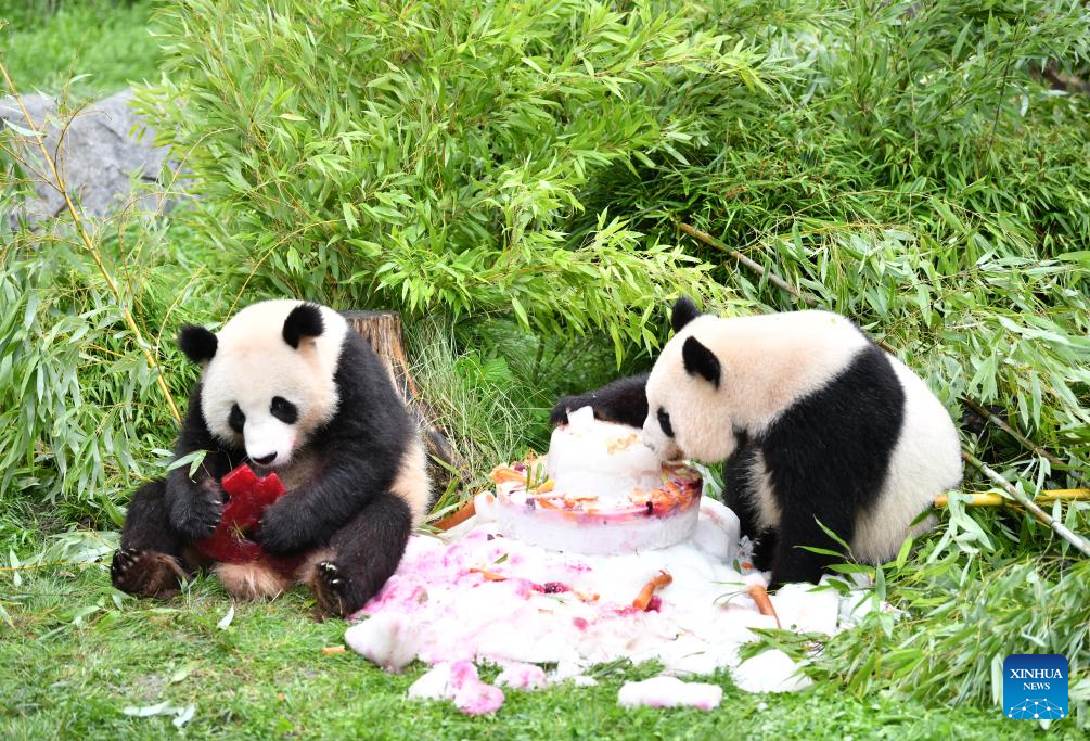 Giant pandas Meng Xiang (L) and Meng Yuan enjoy a "birthday cake" at Zoo Berlin in Berlin, capital of Germany, Aug. 31, 2023. The pair of giant pandas celebrated their fourth birthday in Zoo Berlin on Thursday. (Xinhua/Ren Pengfei)