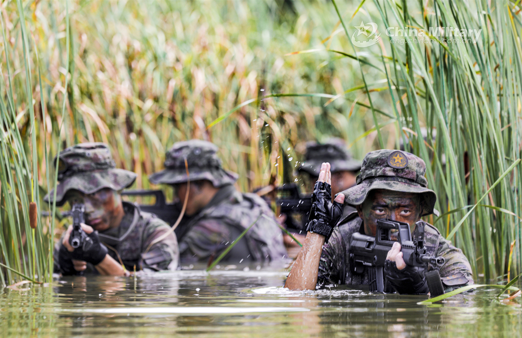 Soldiers assigned to an army brigade infiltrate into simulated enemy area via water route during a real-combat seizure-and-control exercise held in early August. (eng.chinamil.com.cn/Photo by Zhou Shiyu)