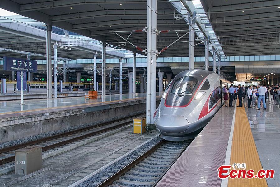 A Fuxing bullet train G4308 departs Nanning, capital of South China's Guangxi Zhuang Autonomous Region, for Guiyang, capital of Guizhou Province, on Aug 31, 2023. (Photo/China News Service)