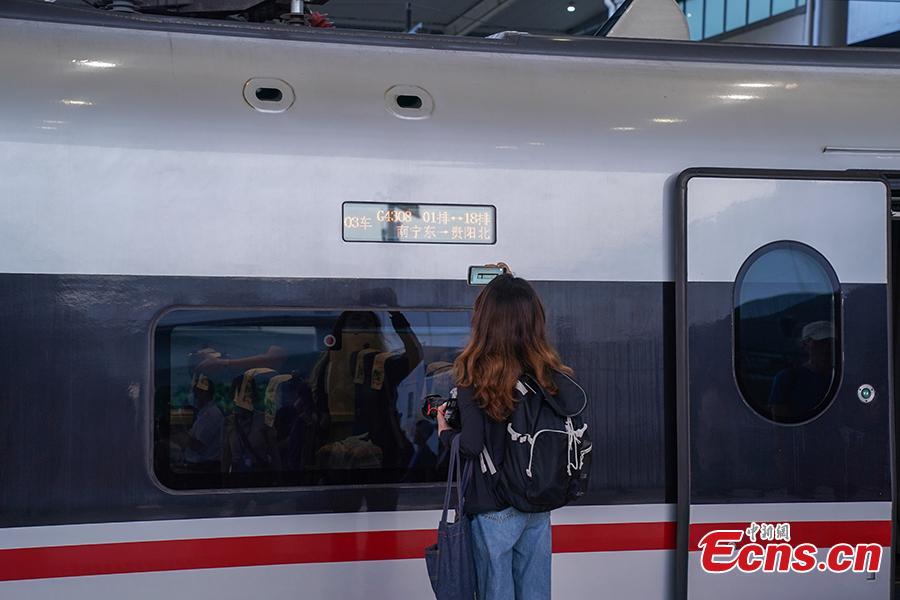 A passenger takes a photo before Fuxing bullet train G4308 departs Nanning, capital of South China's Guangxi Zhuang Autonomous Region, for Guiyang, capital of Guizhou Province, on Aug 31, 2023. (Photo/China News Service)
