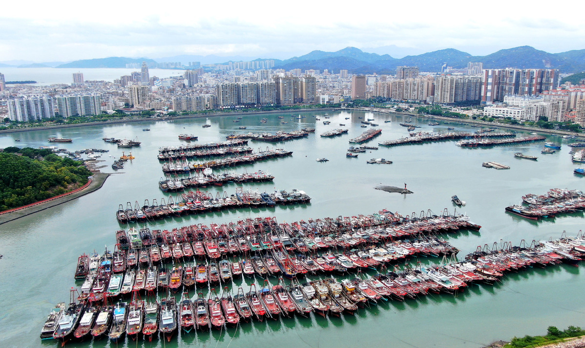 This aerial photo taken on Aug 31, 2023, shows fishing boats taking shelter from the approaching Typhoon Saola at a port in Shangwei, South China's Guangdong province. [Photo/Xinhua]